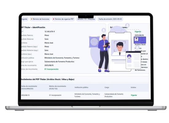 El proceso de Know Your Customer (KYC) es la base de un due diligence confiable. Permite verificar la identidad de personas y empresas, asegurando que la contraparte analizada cumpla con estándares legales, regulatorios y de prevención de riesgos. Nuestro servicio de KYC avanzado conecta en tiempo real con decenas de fuentes nacionales e internacionales, combinando datos públicos, registros oficiales y tecnologías de verificación documental, lo que asegura una identificación integral y confiable.
